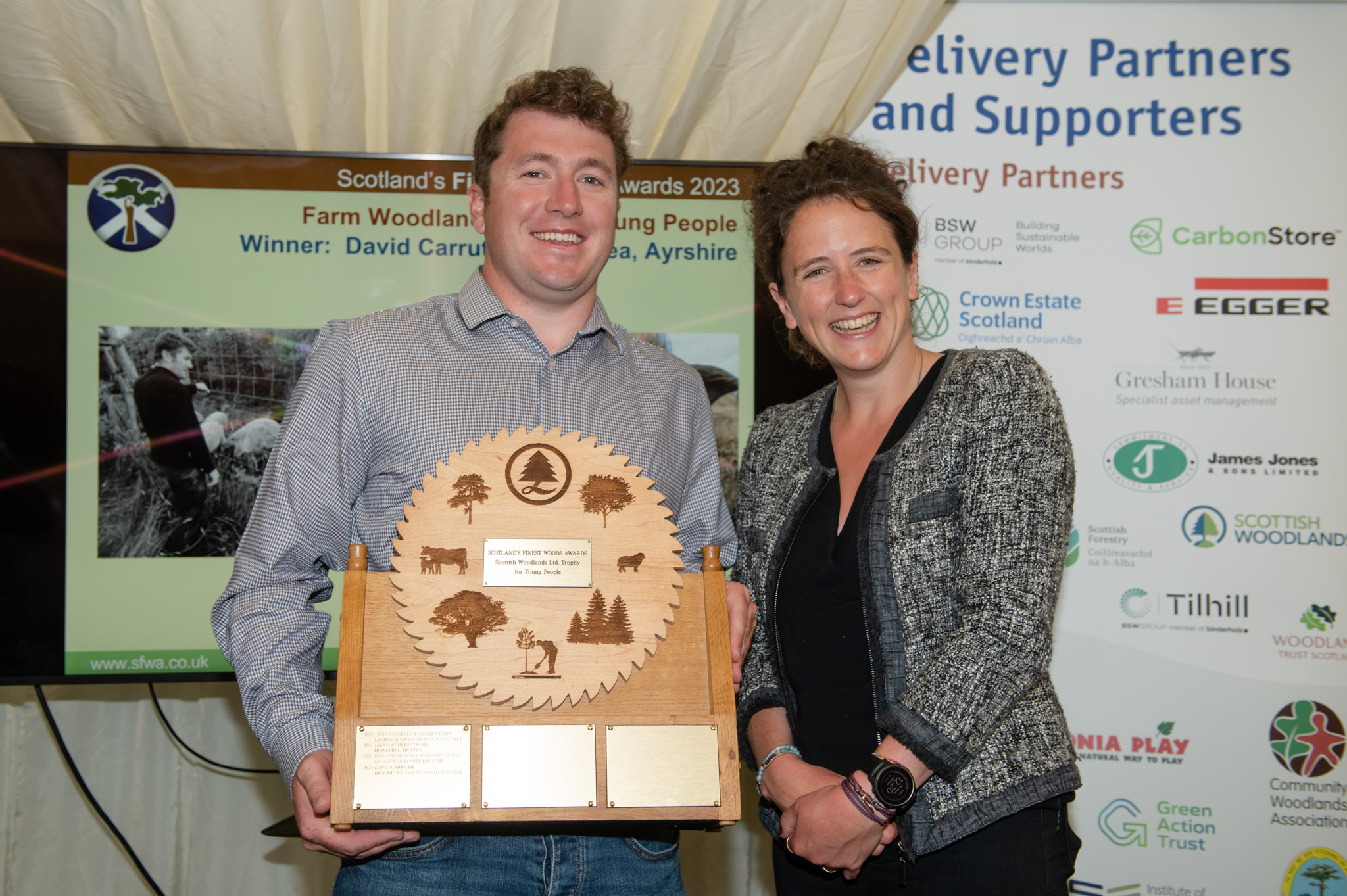 An innovative example of agroforestry using pigs to help grow a forest won David Carruth the Scottish Woodlands Farm Woodland – Young People Trophy at the 2023 Scotland’s Finest Woods Awards.